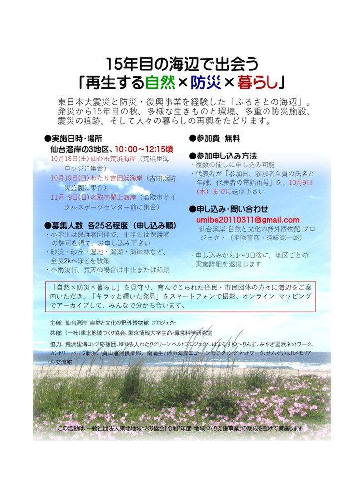 「仙台湾岸 自然と文化の野外博物館 プロジェクト」さんによる催しが10/18・19・11/9に開催されます。ぜひご参考ください🌸🍃