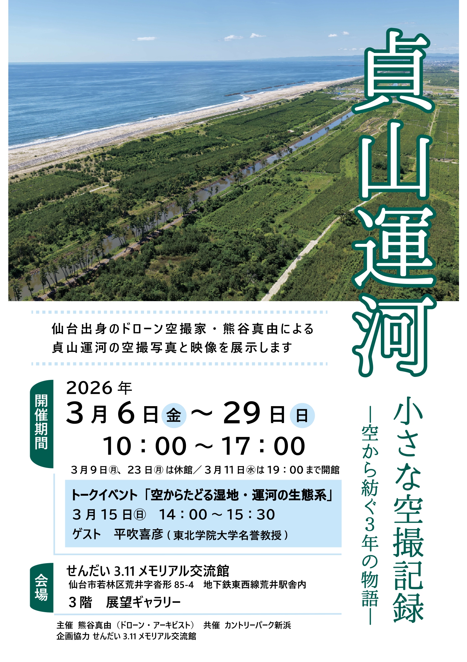 仙台出身のドローン空撮家・熊谷真由による貞山運河の空撮写真と映像を展示します